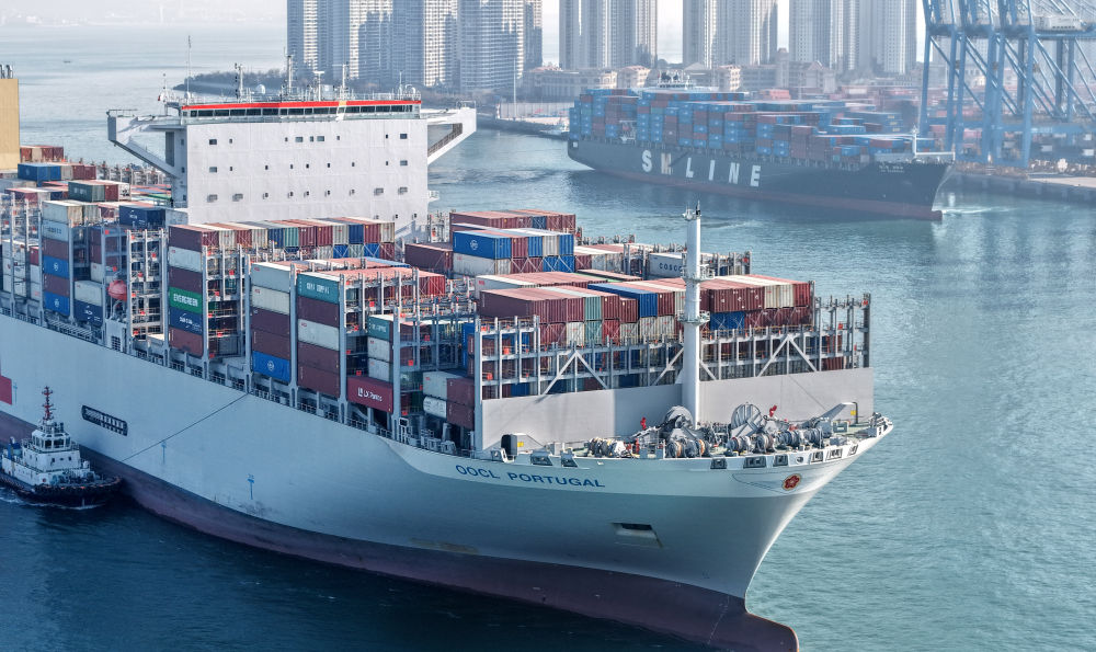 2025年12月4日,货轮进出山东港口青岛港前湾港区(无人机照片)。新华社记者 李紫恒 摄