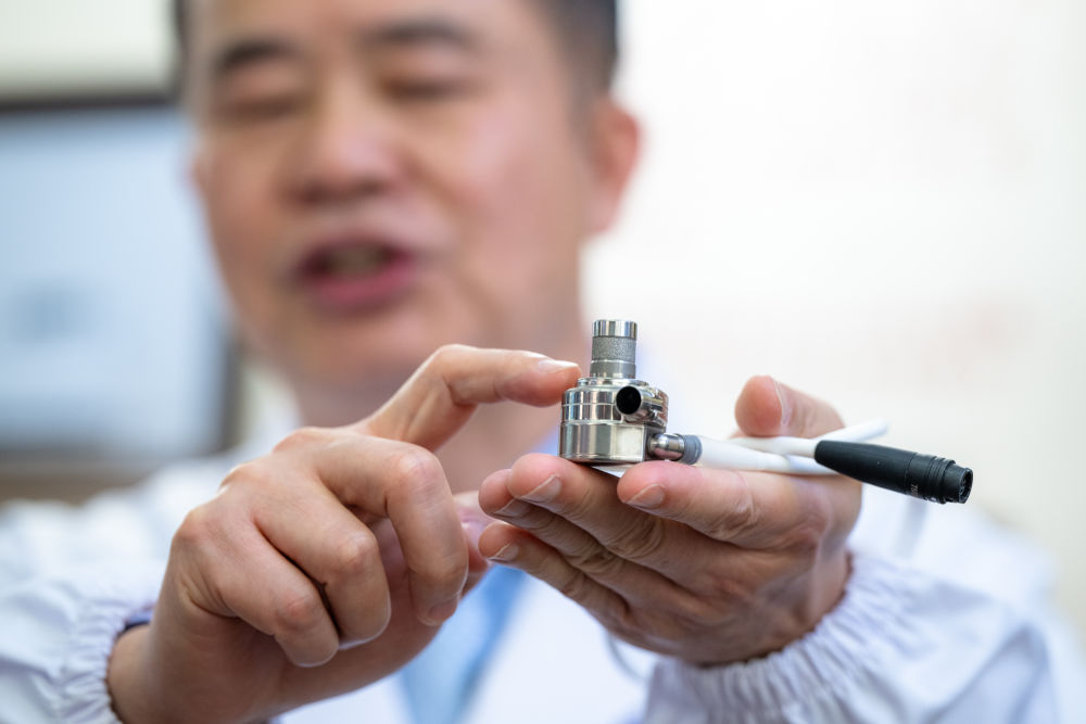 2025年,华中科技大学同济医学院附属协和医院心脏大血管外科主任董念国团队,将历时3年自主研发的儿童用磁悬浮双心室辅助装置,成功植入一名7岁终末期心衰患儿体内,为心衰儿童的治疗提供了中国“心辅助”方案。这是医务人员展示儿童用磁悬浮双心室辅助装置(2025年4月14日摄)。