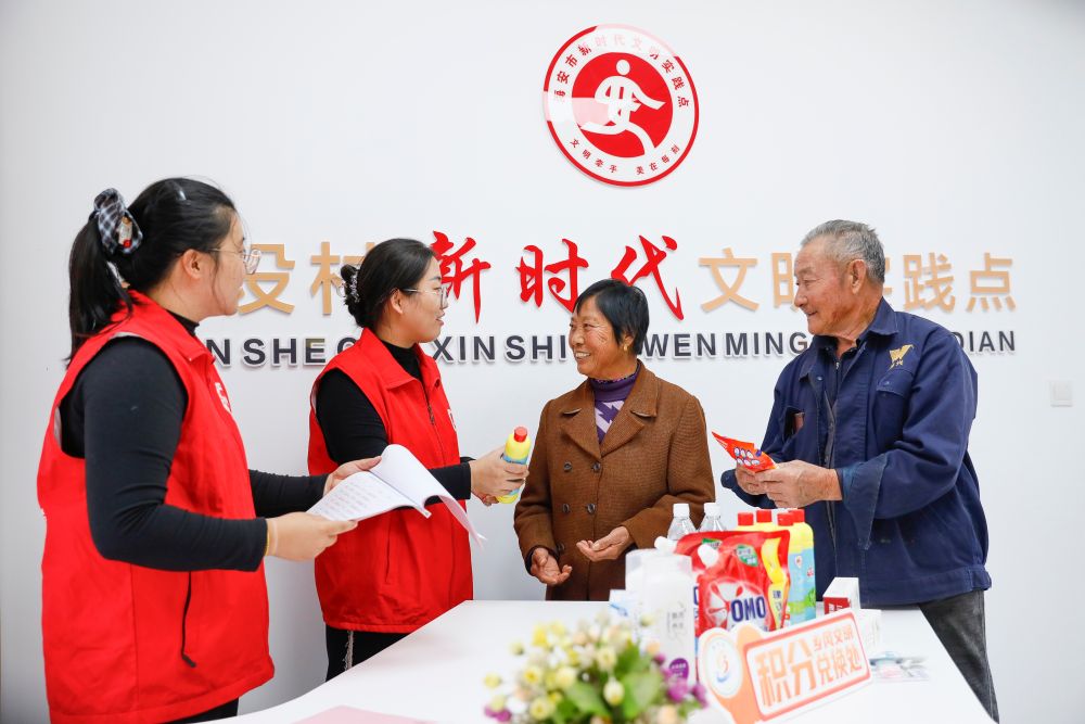 2025年10月25日,江苏省海安高新区隆政街道建设村村民凭文明乡风积分存折兑换日用品。近年来,全国各地立足地域特点,探索出各具特色的乡风文明建设路径。