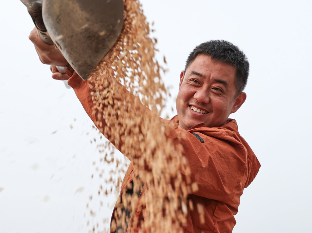 2025年5月27日,江苏省淮安市盱眙县种粮大户刘凯在田间查看收获的小麦。这批小麦选用淮安市农科院选育的良种“淮麦60”。