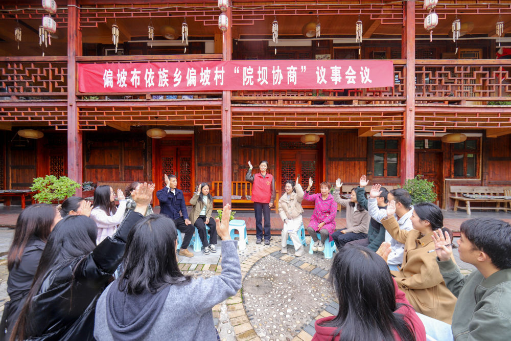 2025年10月27日,贵州省贵阳市乌当区偏坡布依族乡偏坡村的村民们在农家庭院举行“院坝协商”议事会议。