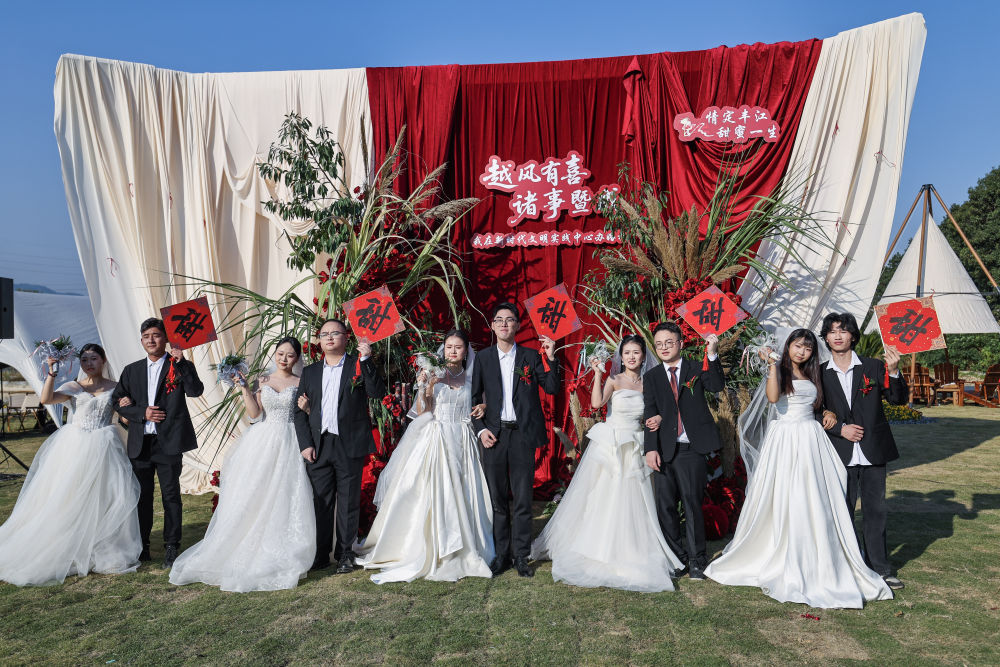 2025年11月23日,浙江省诸暨市安华镇在丰江周村举办集体婚礼,通过特色仪式,倡导“婚事新办简办”的文明新风。