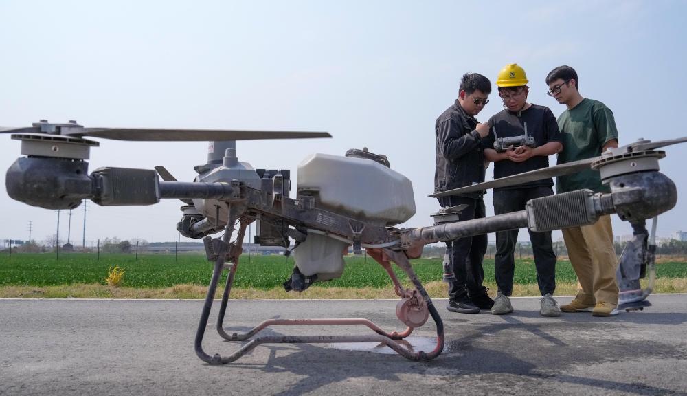 位于江苏昆山的中国农科院华东中心,由中国农业科学院与苏州市政府联合建立,是江苏省探索农业科技新模式与新机制的创新平台。这是中心“90后”工程师耿博健(左)和农业技术人员准备操作无人机进行施肥作业(2025年3月26日摄)。耿博健和团队伙伴运用5G技术和物联网技术,构建无人化智能农事作业平台,实现无人农场智能决策指挥和农事服务管理现代化。