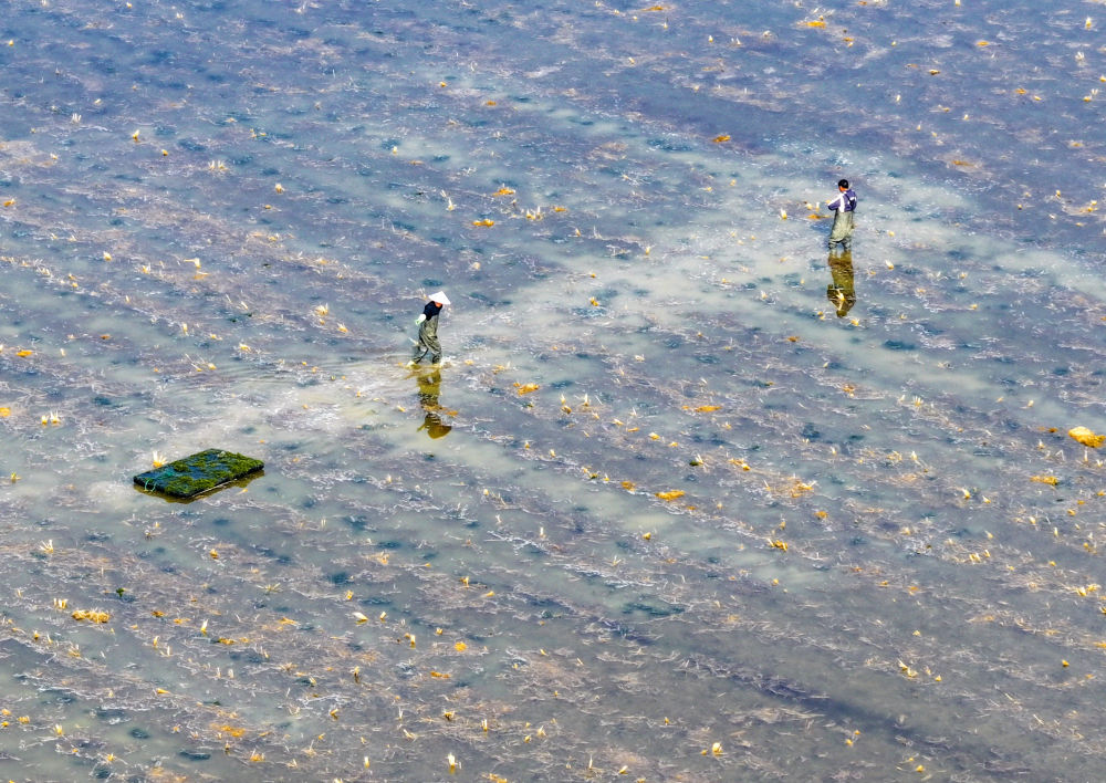 2025年3月8日,农民在江苏盱眙龙虾国家级现代农业全产业链标准化示范基地的虾田里种植水草(无人机照片)。近年来,盱眙大力发展小龙虾产业,有滋有味的小龙虾成为助推乡村振兴的“富民虾”。