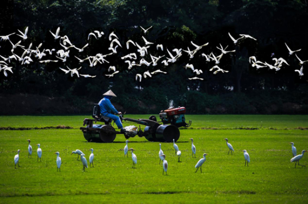 秦山核电附近的金星村草坪基地,白鹭在耕过的地上觅食 宓忠霞摄