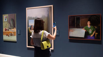 4月19日,一名观众身着汉服在美国旧金山亚洲艺术博物馆举办的“凤凰故国——青铜时代曾楚艺术展”上参观。