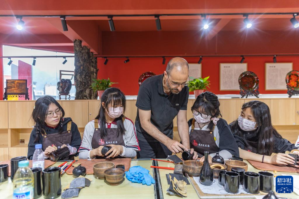 5月10日,法国漆艺家文森·漆(中)指导重庆市城口县职业教育中心学生打磨漆面。
