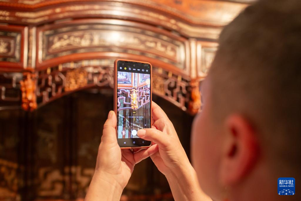 5月29日,在位于卢布尔雅那的斯洛文尼亚民族志博物馆,由故宫博物院专家修复的古建筑内檐装修木质花罩在“斯库谢克亚洲珍品文物展”上展出。