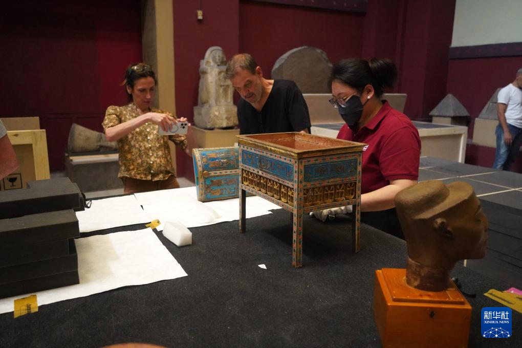 5月23日,在位于埃及首都开罗的埃及国家博物馆,工作人员对一件文物进行打包。