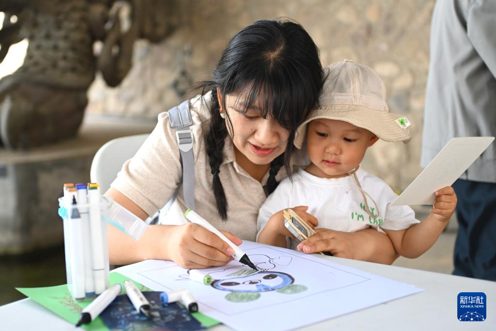 6月15日,在宁夏银川韩美林艺术馆,游客为大熊猫图案上色。