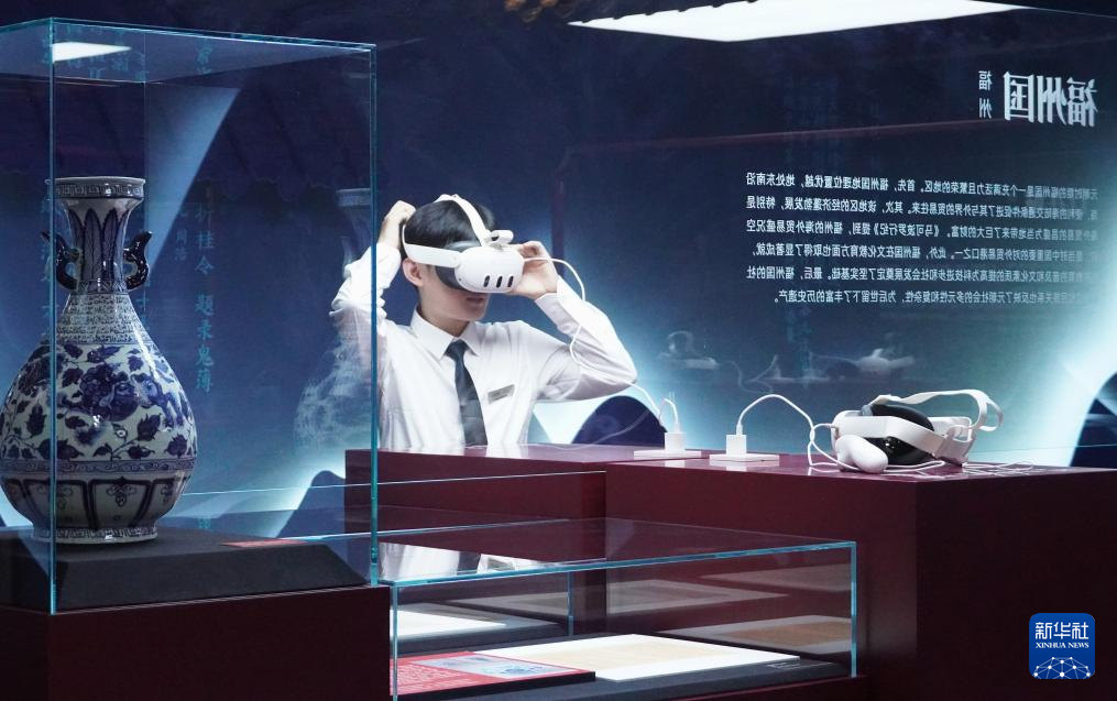 7月3日,参观者在马可·波罗奇迹之旅展上使用MR互动体验装置。