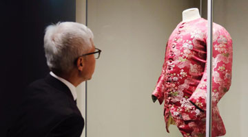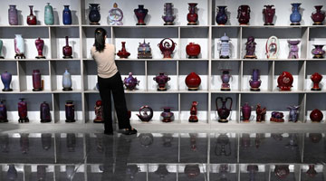 工作人员在河南省禹州市孔家钧窑的展厅里观察钧瓷作品(7月2日摄)。