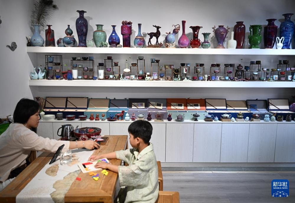 在河南省禹州市神垕镇,一家钧瓷企业的工作人员在展厅内整理展品(7月3日摄)。