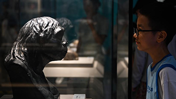 8月15日,一名小朋友在河北博物院参观展览。