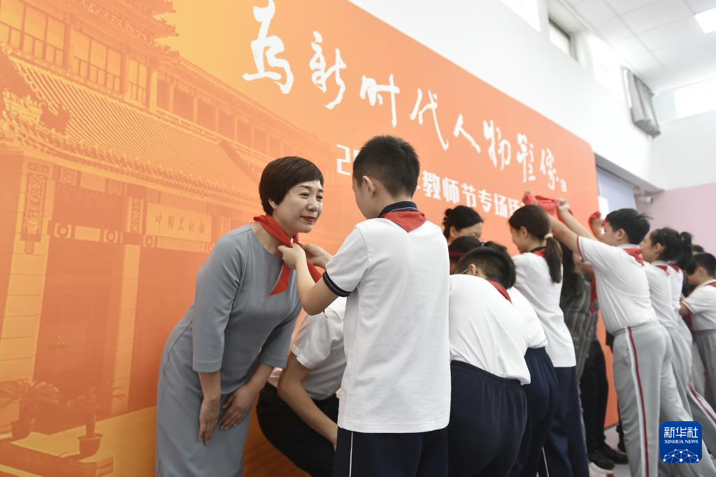 9月10日,学生代表为参加专场活动的优秀教师代表和嘉宾系红领巾。
