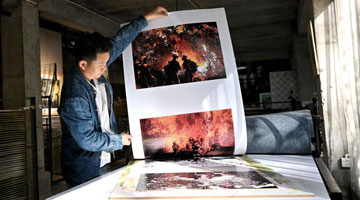 12月9日,西洛在合作社展览厅查看和同事们一起制作的西藏传统面具。