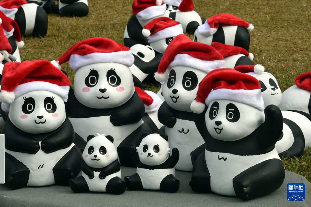 12月25日,大熊猫雕塑在香港中山纪念公园草地上展出。