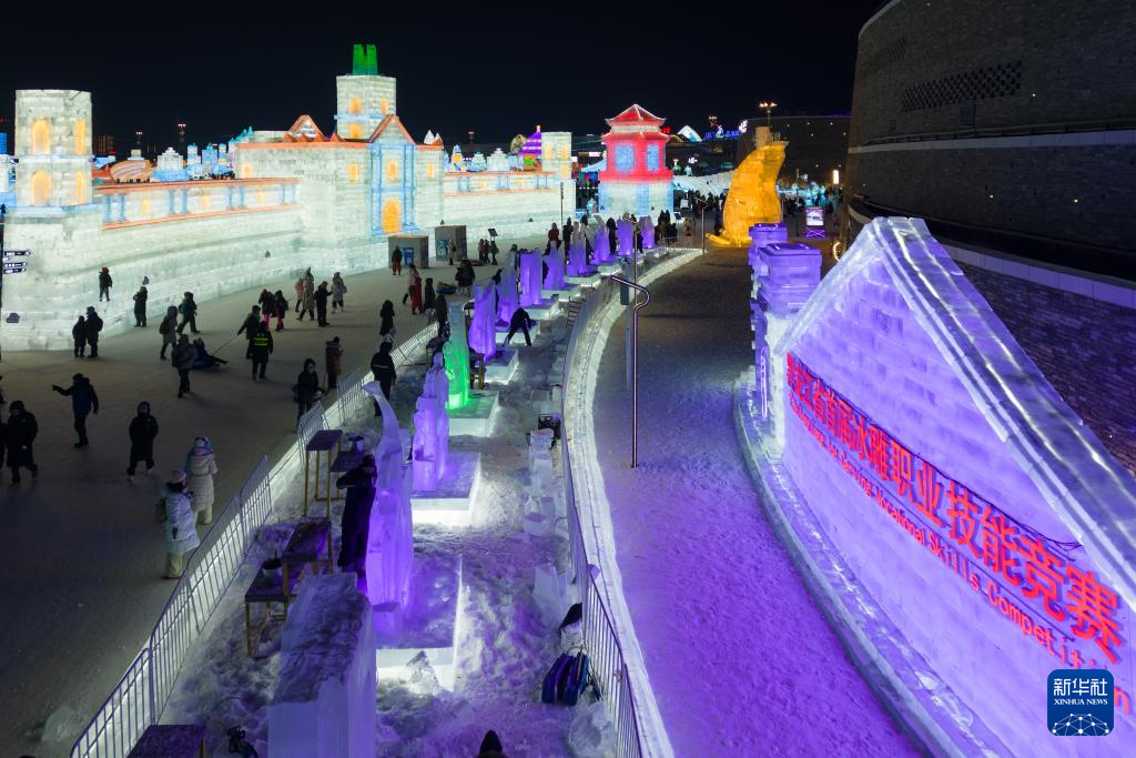 当日,黑龙江省首届冰雕职业技能竞赛在哈尔滨冰雪大世界正式开赛,18支代表队的50多位冰雕选手冰城秀技,吸引众多游客关注。