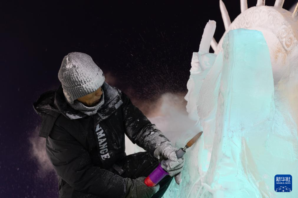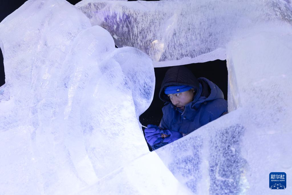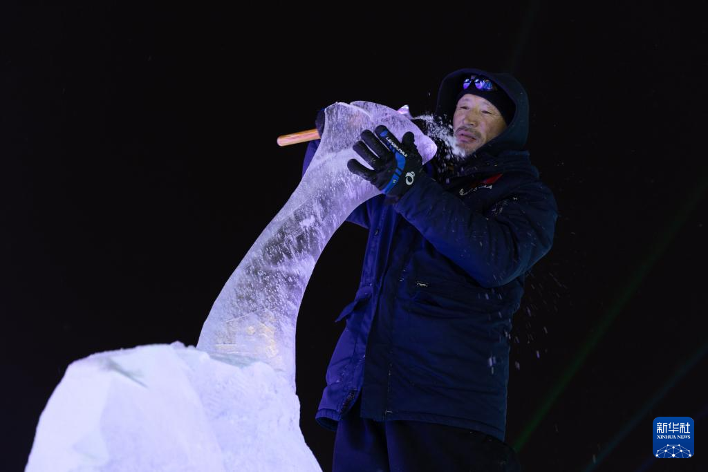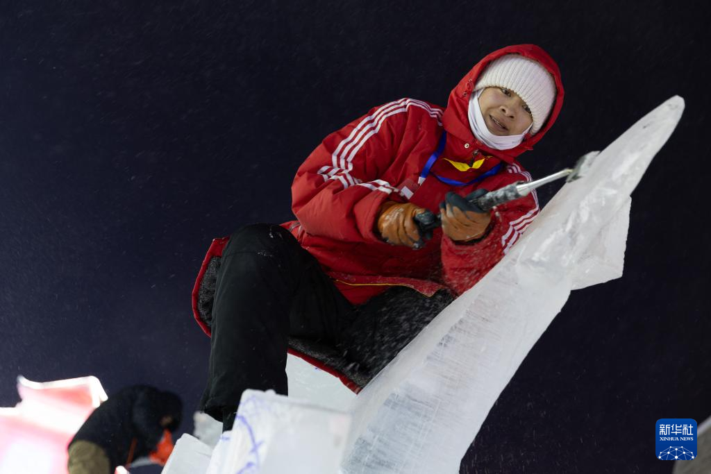 1月15日,参赛选手在哈尔滨冰雪大世界园区进行冰雕创作。