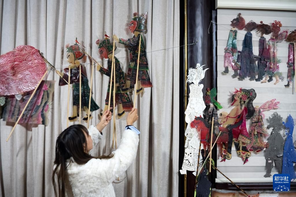 王彪的徒弟李其芳在整理表演用的影人(2月19日摄)。