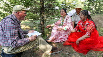 6月28日,张志忠(右)带着学生在寻找烧制瓷器的原料(无人机照片)。