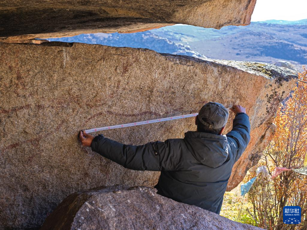 10月21日,陈雪松测量海子山老林沟拉托扎岩画信息。