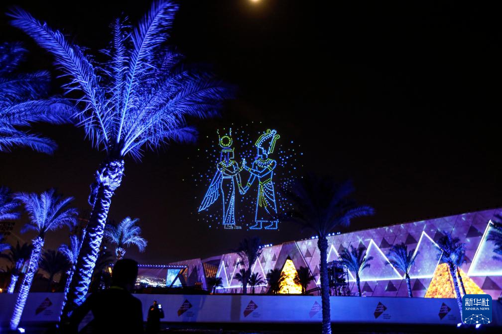 这是11月1日在埃及吉萨拍摄的开馆仪式上的无人机表演和灯光秀。
