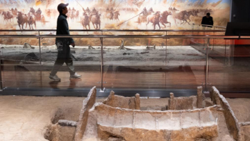 1月29日,工作人员展示活动现场发布的《跃马乾坤 八方来财》雕刻版生肖主题邮票珍藏摆件(左)和《骏驰元宇》邮票珍藏册。