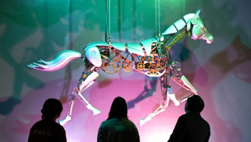 此次展出的古代作品中,元代《饲马图》,线条挺劲,马体健硕,笔墨高古,意境悠远。作者虽不可考,但此画堪称精品。清代《骏马图》出自画马名家俞大年之手,他曾被誉为得曹霸、韩幹心传,笔下之马,形神皆妙。清末名家任伯年以写意手法画马,开创水墨马之先河。以人物画见长的钱慧安,极少画马,此次展出的《春风得意马蹄疾》,线条遒劲流畅,造型精准生动,雅俗共赏。