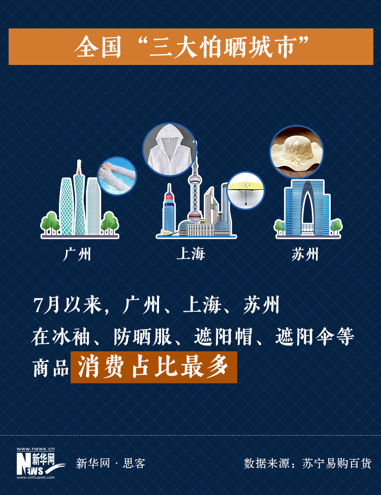 苏宁易购百货数据显示,7月以来,冰袖、防晒服、遮阳帽、遮阳伞等商品销量同比提升超200%,成为夏日街头防晒神器。其中,广州、上海、苏州的消费占比最多,成为全国“三大怕晒城市”。