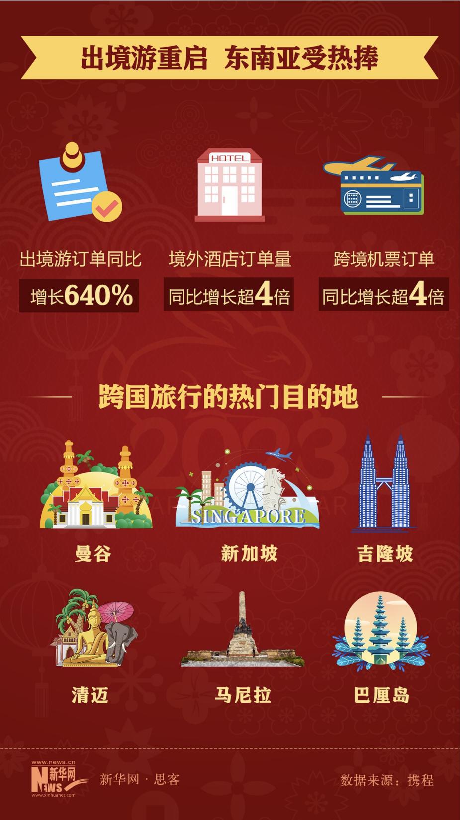 出境游方面,根据携程统计数据,春节期间出境游整体订单同比增长640%,内地旅客预订境外酒店订单量同比增长超4倍,跨境机票订单增长4倍以上。其中,旅游资源充沛又热情好客的东南亚更是成为春节档大赢家。数据显示,曼谷、新加坡、吉隆坡、清迈、马尼拉、巴厘岛等成为最受中国旅客欢迎的跨国旅行目的地,均为东南亚目的地。