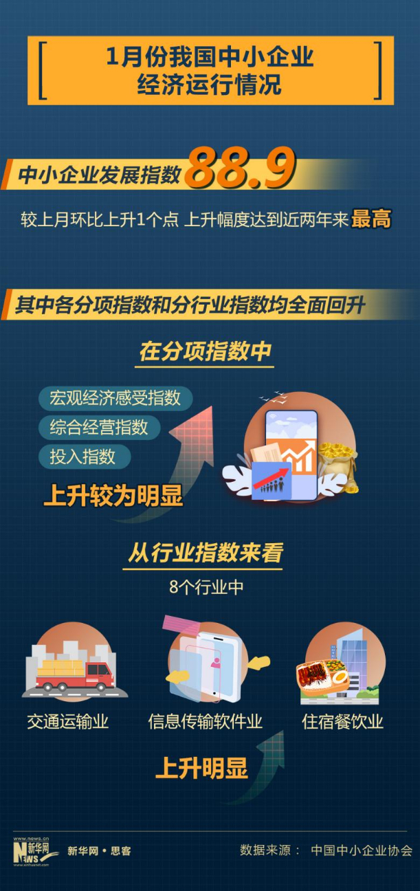 近日中国中小企业协会公布我国中小企业经济运行情况。2023年1月份,中国中小企业发展指数为88.9,比去年12月回升1个点,上升幅度达到近两年来最高。其中,企业发展信心回升,反映企业信心状况的宏观经济感受指数为98.7,比上月上升2.1点。市场预期有所提振,市场指数为80.7,环比上升0.9点。