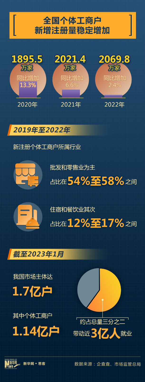 近日市场监管总局统计显示,截至2023年1月,我国市场主体达1.7亿户,其中个体工商户1.14亿户,约占总量三分之二,带动近3亿人就业。