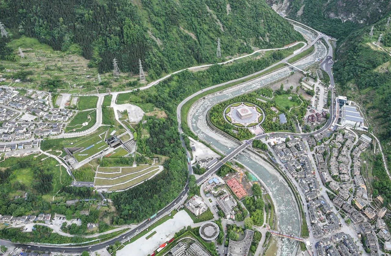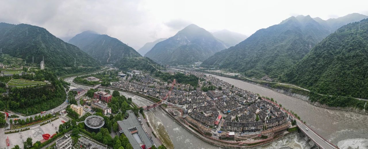 ▲这是2022年5月12日拍摄的汶川县映秀镇一角(无人机全景照片)。新华社记者 王曦 摄