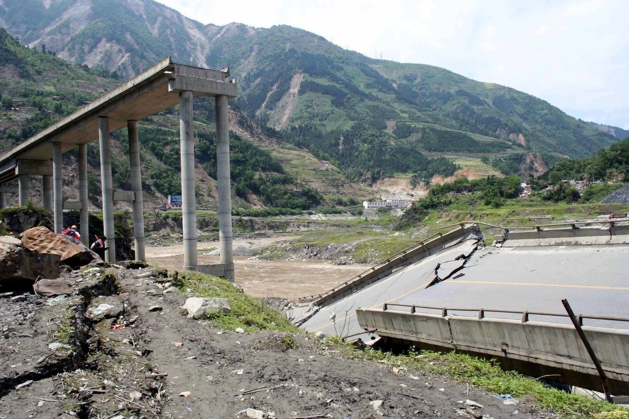 ▲这是在地震中垮塌的四川省汶川县映秀镇白花大桥(2008年5月14日摄)。新华社记者 徐博 摄