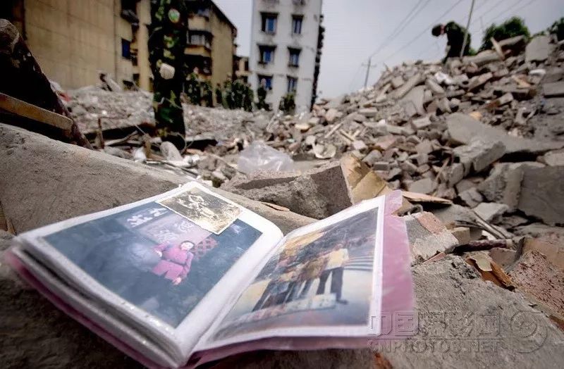 ▲2008年5月15日 地震过后的都江堰市,废墟中一本残留下来的相册静静躺在废墟上。图片来源:央视新闻