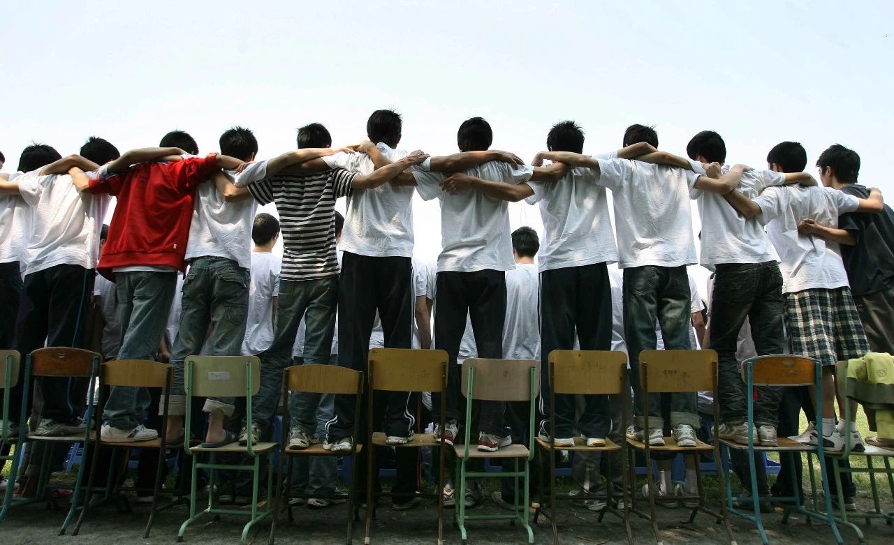 ▲2008年5月19日,四川绵阳长虹培训基地,北川中学高三复课仪式举行,合影时同学们都不约而同靠得更紧。图片来源:央视新闻