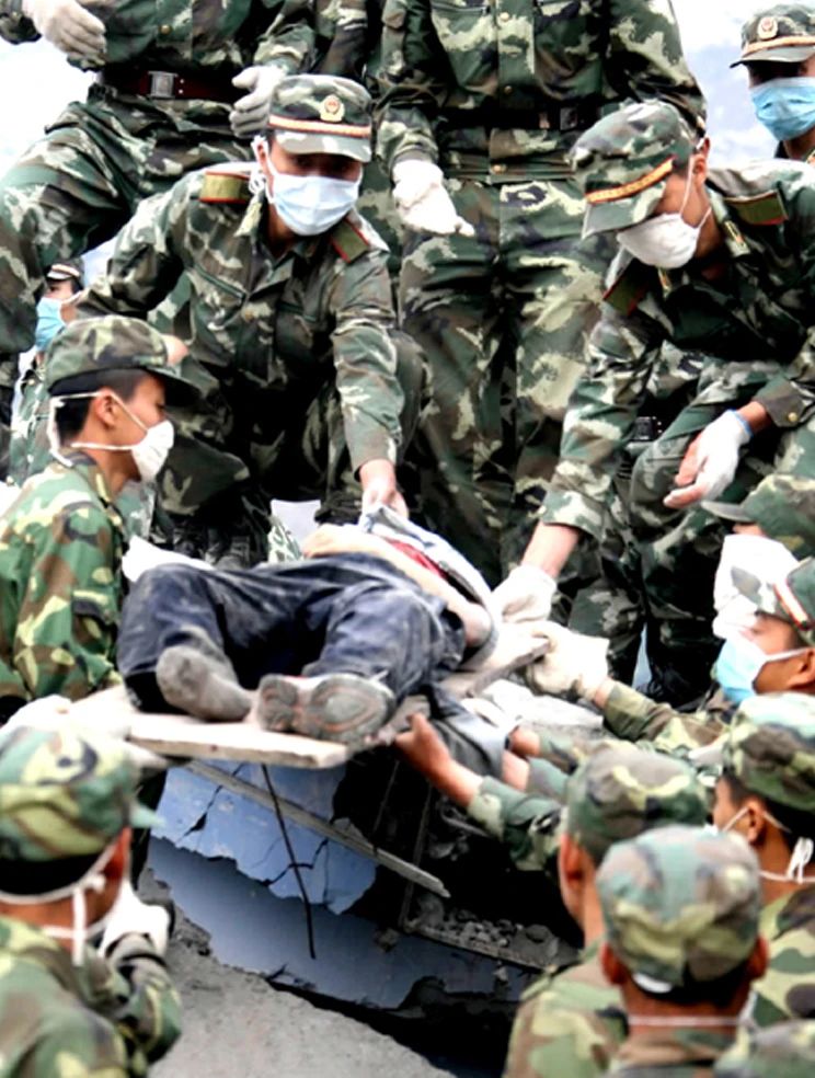 ▲2008年5月13日,四川绵阳北川县,武警战士奔向房屋坍塌现场,抢救被困伤员。图片来源:央视新闻