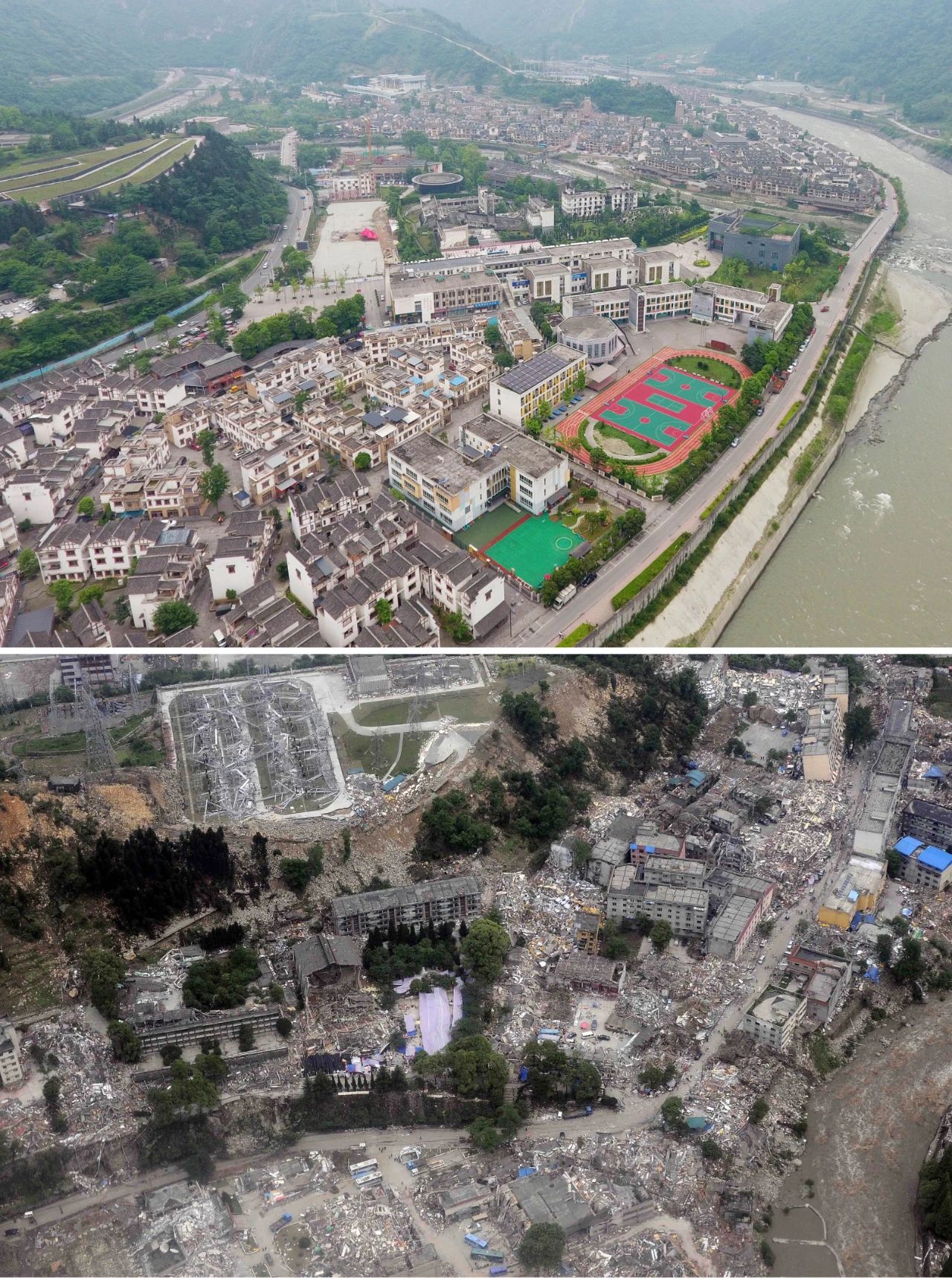 ▲拼版照片上图为2018年5月5日无人机拍摄的汶川县映秀镇风貌(新华社记者 刘坤 摄);下图为2008年5月14日拍摄的地震后汶川县映秀镇(新华社记者 陈凯 摄)。