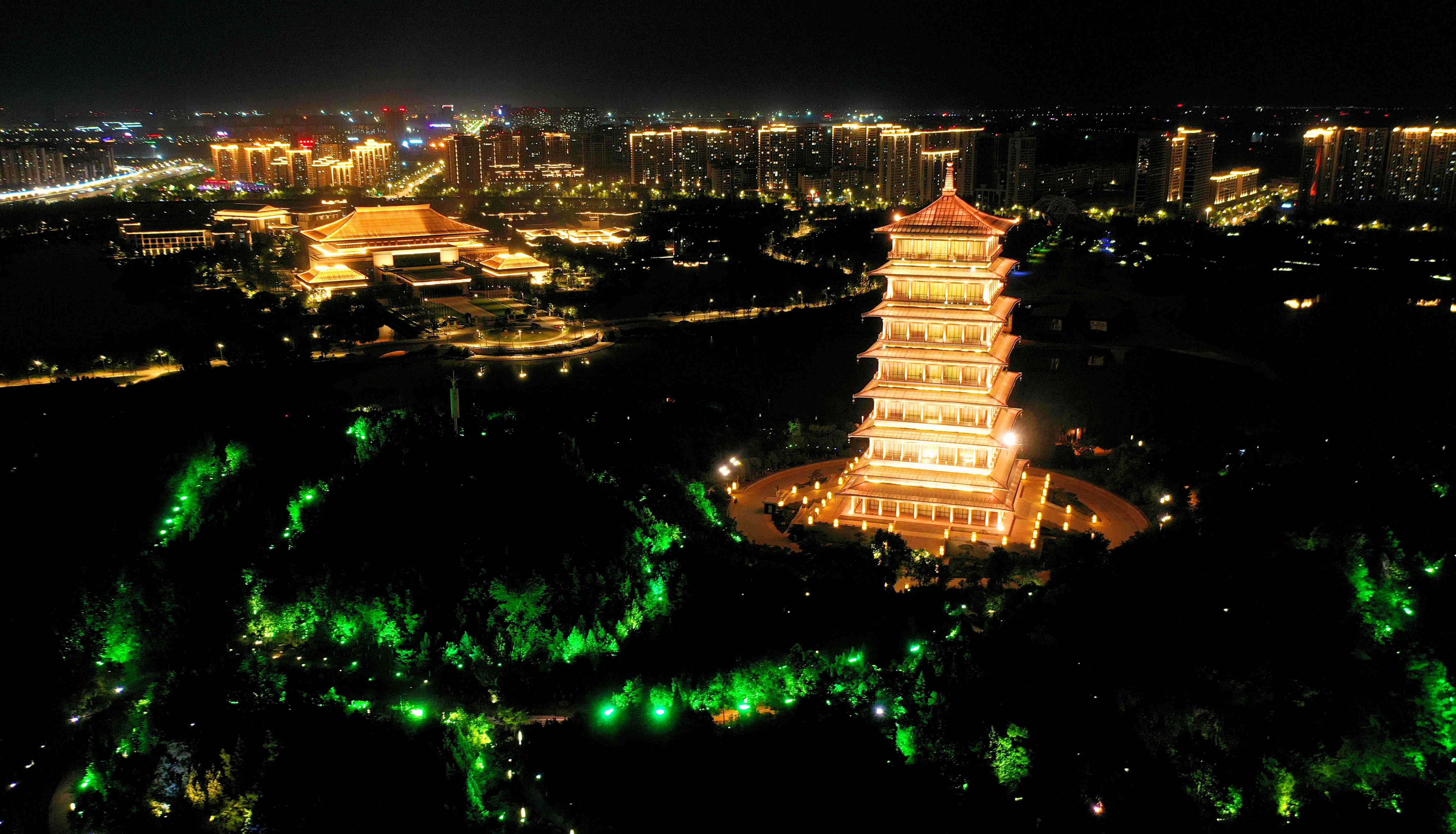 位于西安浐灞生态区西安世博园内的长安塔(5月1日摄,无人机照片)。新华社记者 刘潇 摄