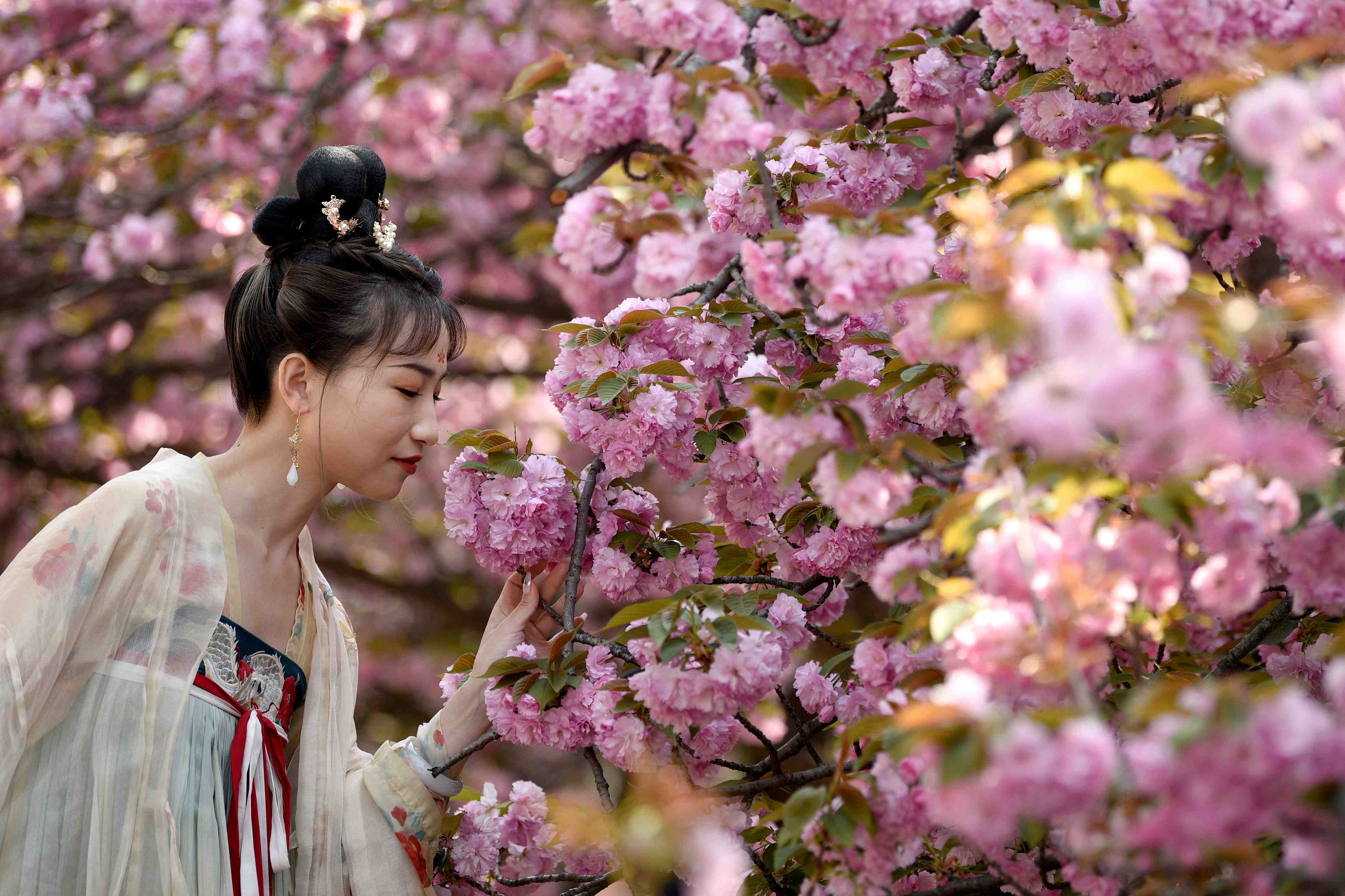 在位于乐游原的青龙寺遗址景区内,国风爱好者在赏花游览(3月31日摄)。新华社记者 刘潇 摄