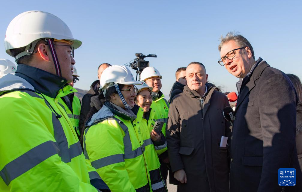 12月29日,在塞尔维亚戈卢巴茨市,塞尔维亚总统武契奇(右一)视察“多瑙走廊”快速路项目时与中方工作人员交谈。新华社发(王韡摄)