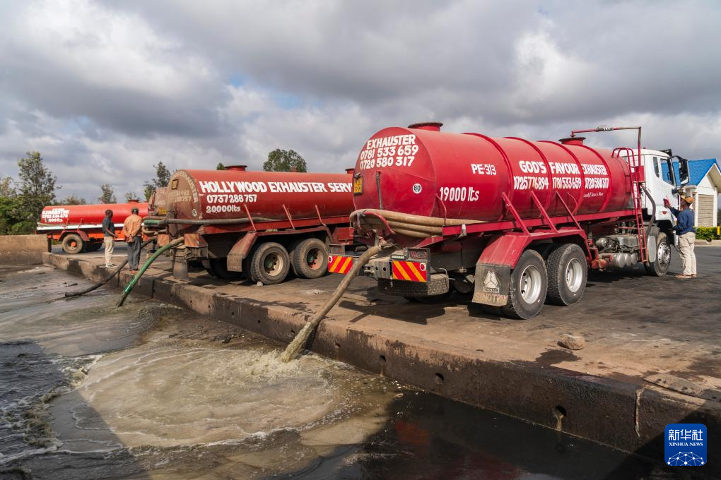 在位于肯尼亚内罗毕的丹多拉污水处理厂,吸污车向弃污点排放城市污水(2月6日摄)。 新华社记者 谢剑飞 摄