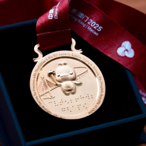 值得一提的是,本届竞体项目奖牌的会徽面首次采用无文字设计,纯以图案叙事:同心礼花由下方的牡丹托举,生动诠释了粤港澳大湾区在祖国的坚实依托下蓬勃发展,绽放于世界舞台,呈现“三花映牡丹,盛世绽芳华”的美好景象。