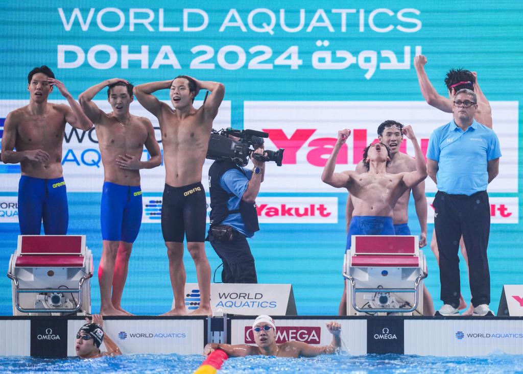 2024年2月16日,中国队选手王浩宇(右三)、季新杰(右四)、张展硕(右下)在比赛后庆祝。当日,在卡塔尔多哈举行的2024年世界游泳锦标赛游泳项目男子4X200米自由泳接力决赛中,由季新杰、王浩宇、潘展乐、张展硕组成的中国队以7分1秒84的成绩夺得金牌。 新华社记者 杜宇 摄