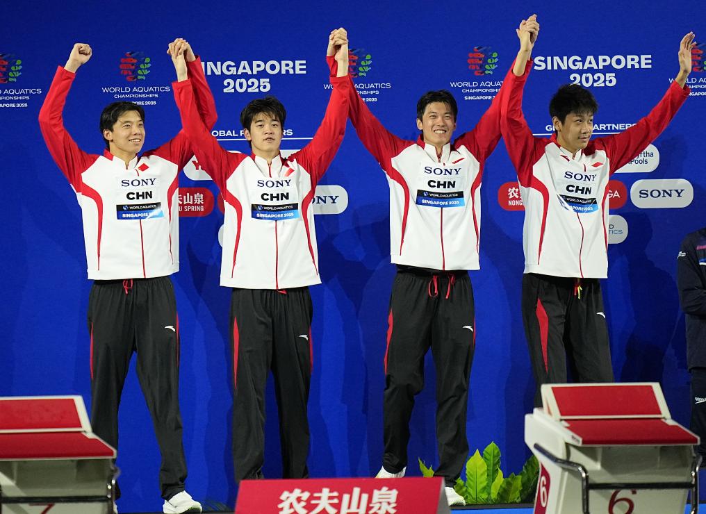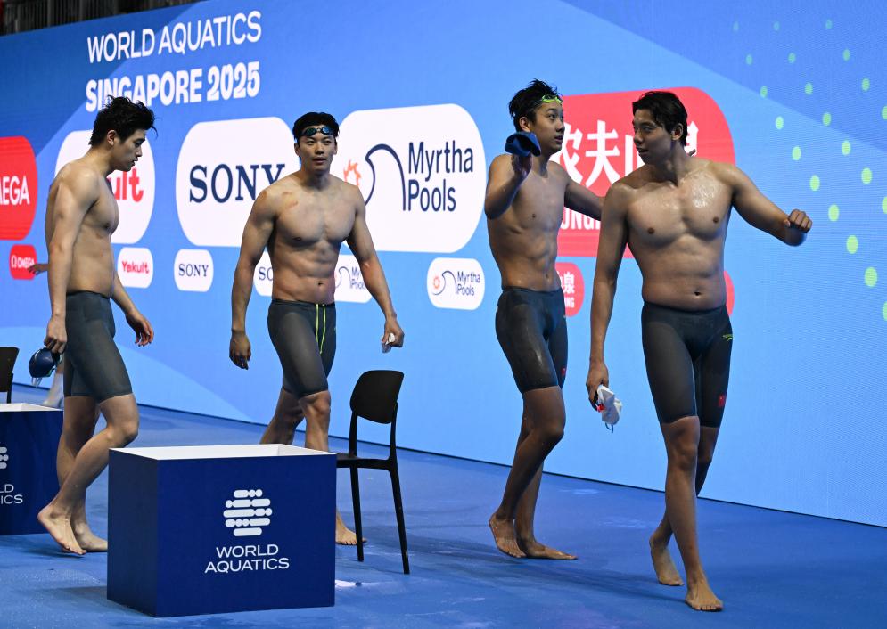 2025年8月1日,亚军由潘展乐、汪顺、张展硕、季新杰(从左至右)组成的中国队在比赛后。新华社记者 夏一方 摄