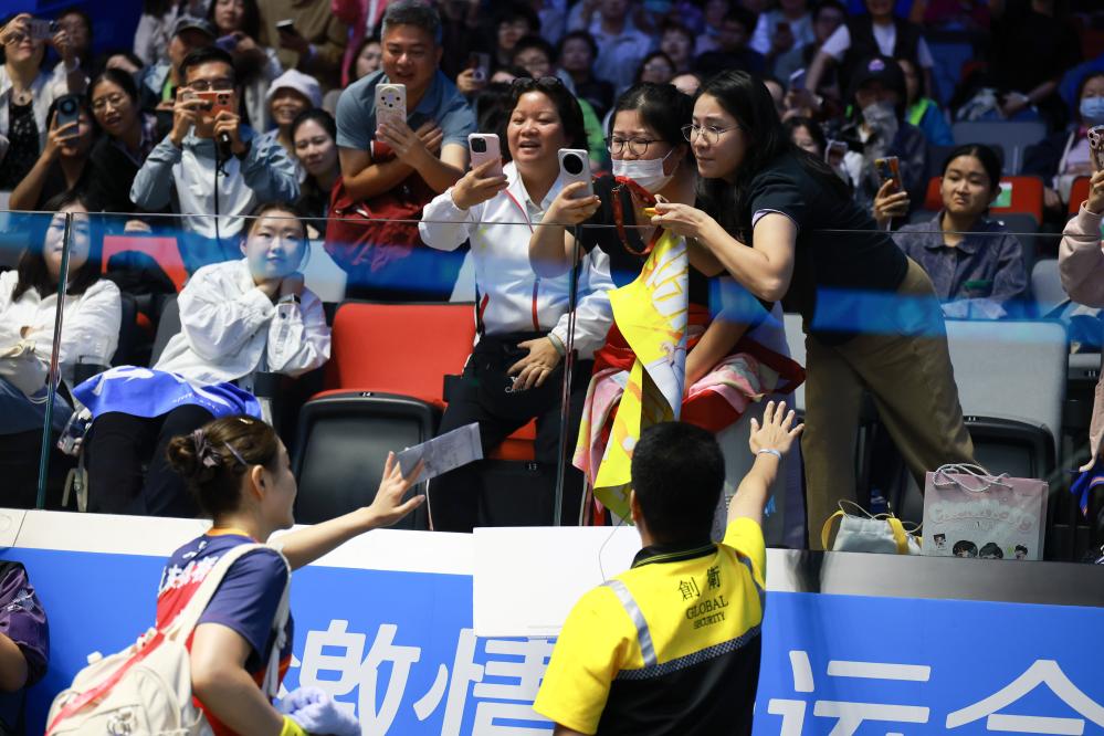 2025年11月11日,陈梦(前左)在第十五届全国运动会乒乓球女子单打1/16决赛后与观众互动。新华社记者 刘续 摄