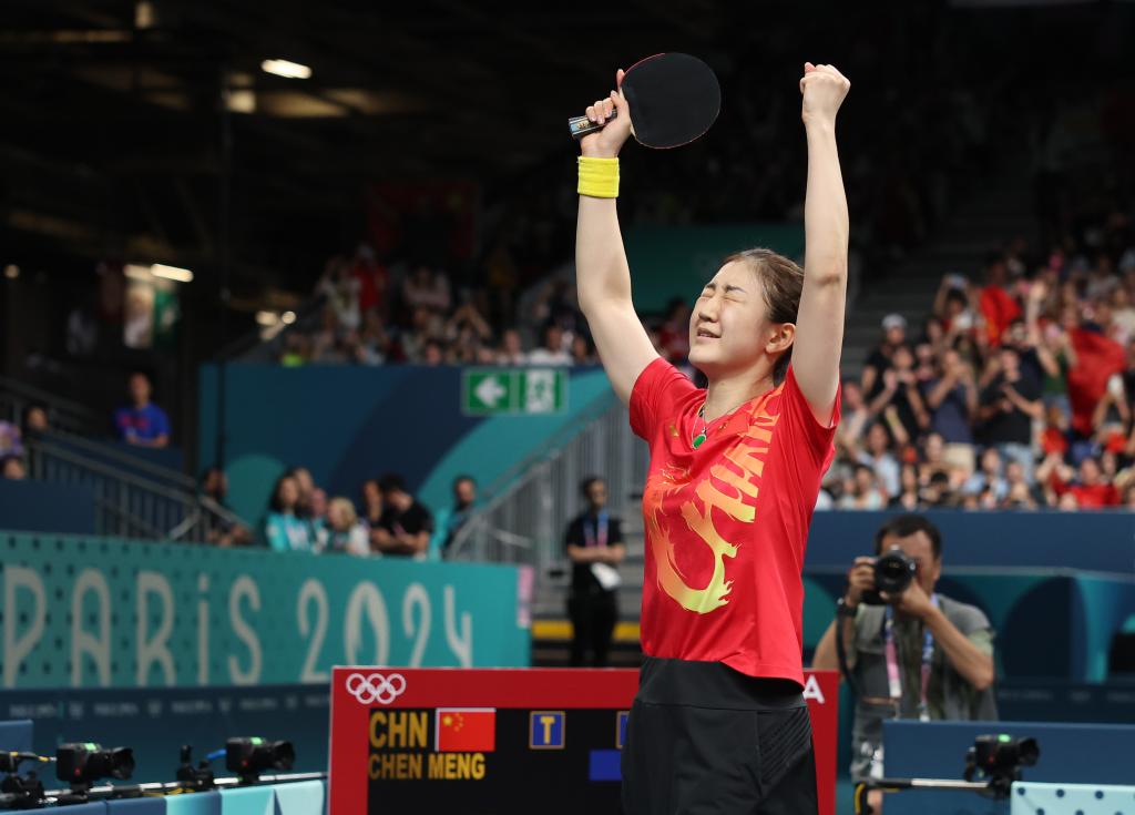 2024年8月3日,陈梦在巴黎奥运会乒乓球女单决赛后庆祝胜利。新华社记者 王东震 摄