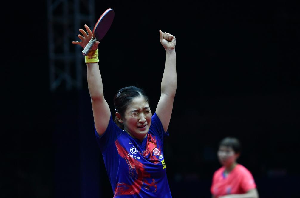 2019年4月27日,在匈牙利布达佩斯举行的2019世界乒乓球锦标赛女单决赛中,刘诗雯以4比2战胜队友陈梦后庆祝夺冠。新华社记者 陶希夷 摄