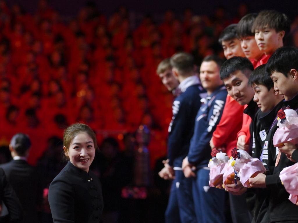 2024年2月25日,国际乒联运动员委员会主席刘诗雯(左)作为颁奖嘉宾出席国际乒联釜山世界乒乓球团体锦标赛男子团体颁奖仪式。新华社记者 陶希夷 摄